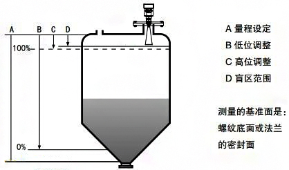 2、若介質為低介電常數當其處于低液位時,罐低可見,為保證測量精度,建議將零點定在低高度為C的位置。
